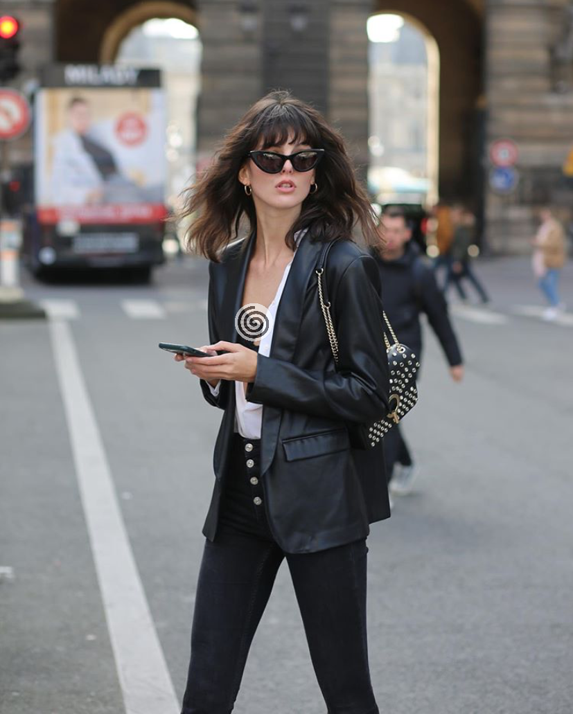 有些款式会让你一眼感受到岁月沉淀的魅力,皮衣带着男士款风格,宽大的直角剪裁,让魅力风情的法国女人带出些棱角,也仿佛有着让时光凝固的力量,构成很有画面感的造型。